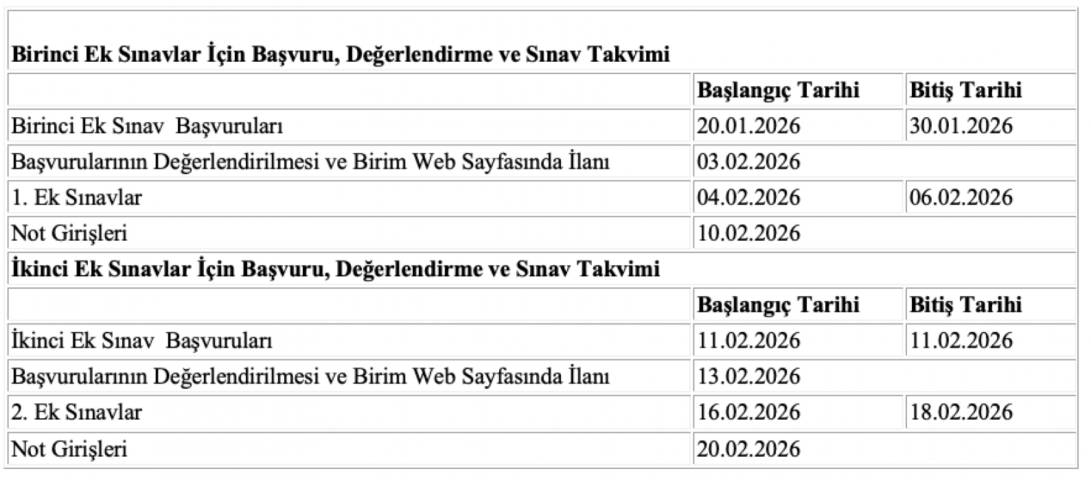 2547 sayılı Yükseköğretim Kanununun 44 üncü maddesinin (c) bendinde “Azami süreler sonunda kayıtlı olduğu öğretim kurumundan mezun olabilmek için son sınıf öğrencilerine, başarısız oldukları bütün dersler için iki ek sınav hakkı verilir..." hükmü çerçevesinde 2025-2026 Eğitim-Öğretim Yılı Güz Yarıyılı sonunda azami süresi sona eren öğrencilerin ek sınav takvimi aşağıdaki gibidir.