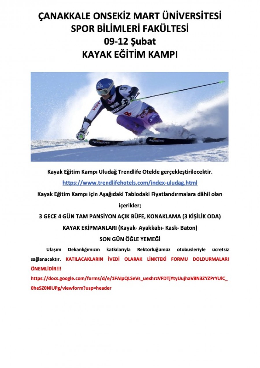 2025-2026 Kayak Eğitim Kampı 9-12 Şubat tarihleri arasında Uludağ Trendlife Otel'de gerçekleştirilecektir. Kampa katılmak isteyen öğrenci ve personelimizin ivedilikle aşadaki online katılım formunu doldurmaları gerekmektedir.