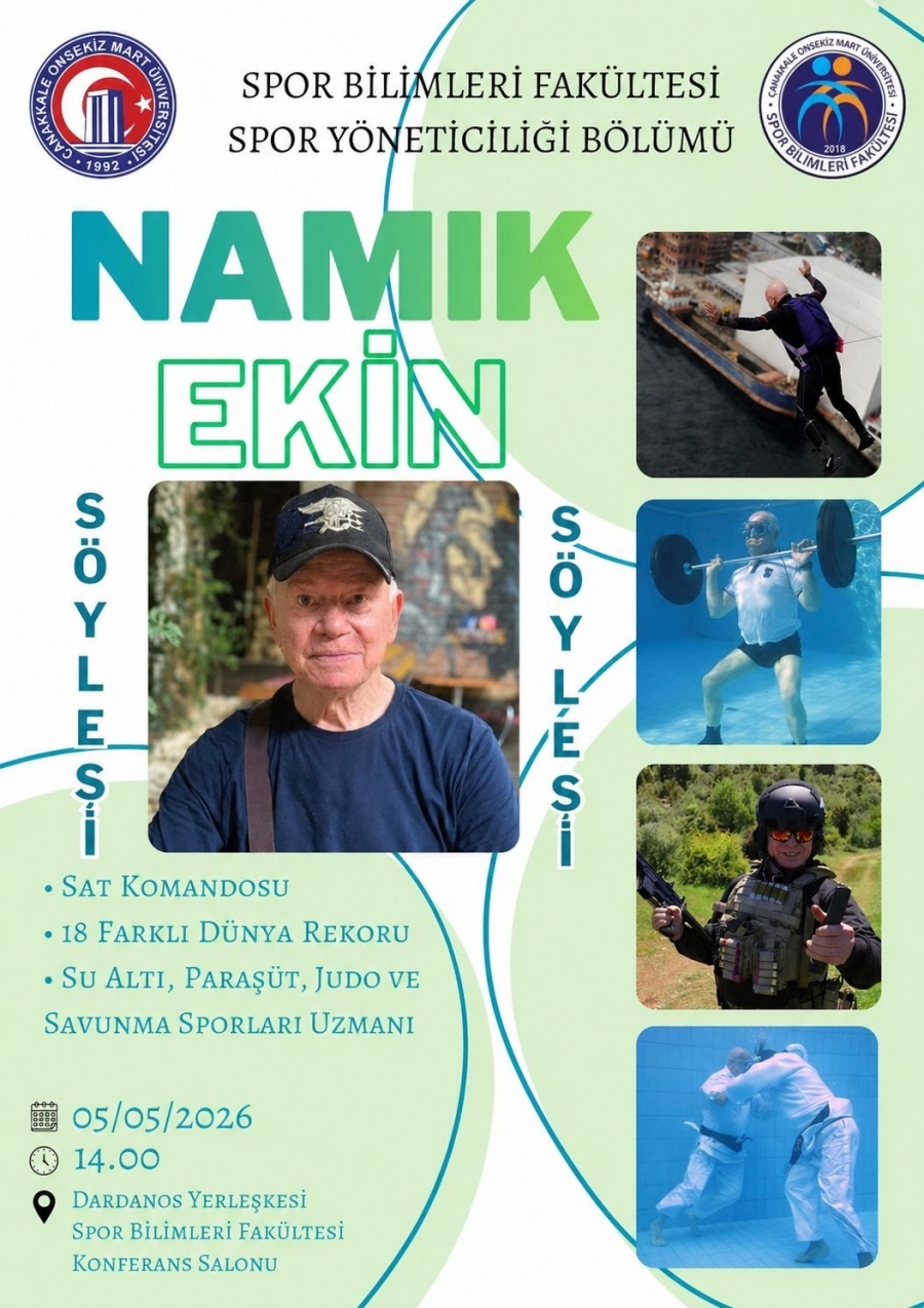 SAT Komandosu olan ve 18 farklı dünya rekoruna sahip Namık Ekin; su altı, paraşüt, judo ve savunma sporları alanındaki bilgi ve deneyimlerini katılımcılarla paylaşacaktır.