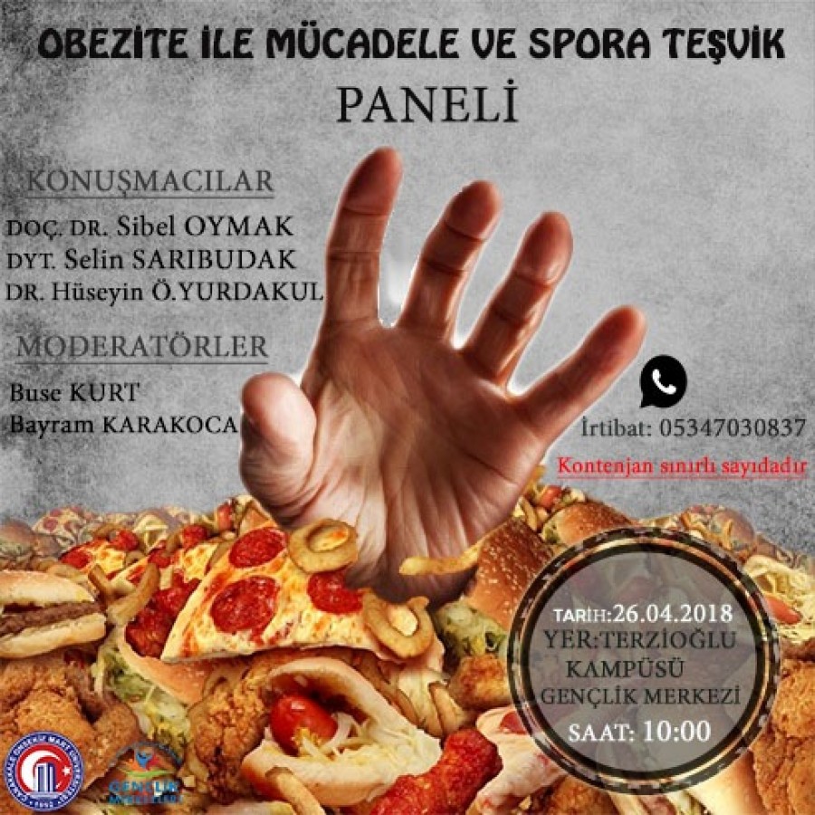 Spor Bilimleri Fakültesi Spor Yöneticiliği 4. Sınıf öğrencileri tarafından ''Organizasyon ,Planlama ve Uygulama'' dersi kapsamında 26-04-2018 Perşembe günü saat:10.00-12.00 saatleri arasında Terzioğlu Yerleşkesi Mehmet Akif Ersoy Gençlik Merkezi'nde ''Obazite ile mücadele ve spora teşvik paneli'' yapılacaktır.