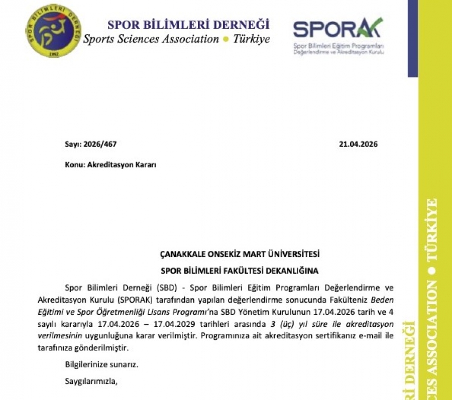 Yapılan detaylı değerlendirmeler sonucunda, SBD Yönetim Kurulu’nun 17.04.2026 tarihli kararıyla programımızın eğitim kalitesi tescillenmiştir. Bu kapsamda Beden Eğitimi ve Spor Lisans Programımız, 17.04.2026 ile 17.04.2029 tarihleri arasında 3 (üç) yıl süreyle akreditasyon sertifikası almıştır.